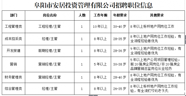 附件:阜阳市安居投资管理有限公司招聘职位信息
