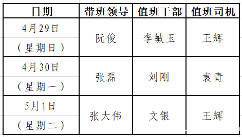 为贯彻落实《国务院办公厅关于2018年部分节假日安排的通知》和省委办公厅、省国资委关于做好2018年节假日期间值班工作的要求,现将公司2018年劳动节放假、安全生产、假日公务车辆使用管理及值班的有关要求通知如下: