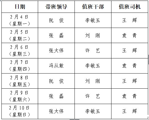 为贯彻落实《国务院办公厅关于2019年部分节假日安排的通知》和省委省政府办公厅、省国资委、集团公司关于值班工作的要求,现将2019年春节放假、值班安排、廉洁提醒及公务车辆管理通知如下: