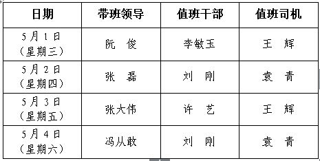 为贯彻落实《国务院办公厅关于2019年部分节假日安排的通知》和省委省政府办公厅、省国资委、集团公司关于值班工作的要求,现将2019年五一劳动节放假、值班安排、节日期间安全生产及公务车辆管理通知如下: